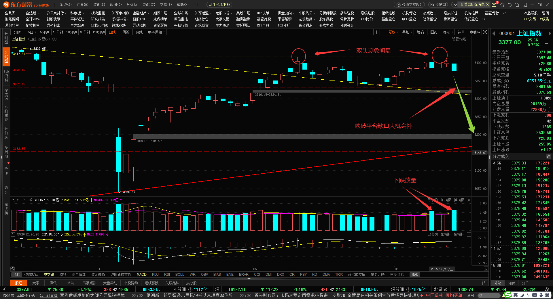 沪指上周收跌0.25%,看似跌幅不大,但我觉得风险更大,从技术走势上来看自关税战跌至3040.69点后反弹至3417.31,然后开始平台整理,近一个月也一直没突破3417.31的高点,尤其是上周本来有机会向上突破,但仍未能突破,量价上也是上涨缩量下跌放量,我觉得有做短期双头的迹象,一旦跌破平台(3332.49),势必去补3200点附近的缺口,这样才能完整的完成技术走势。